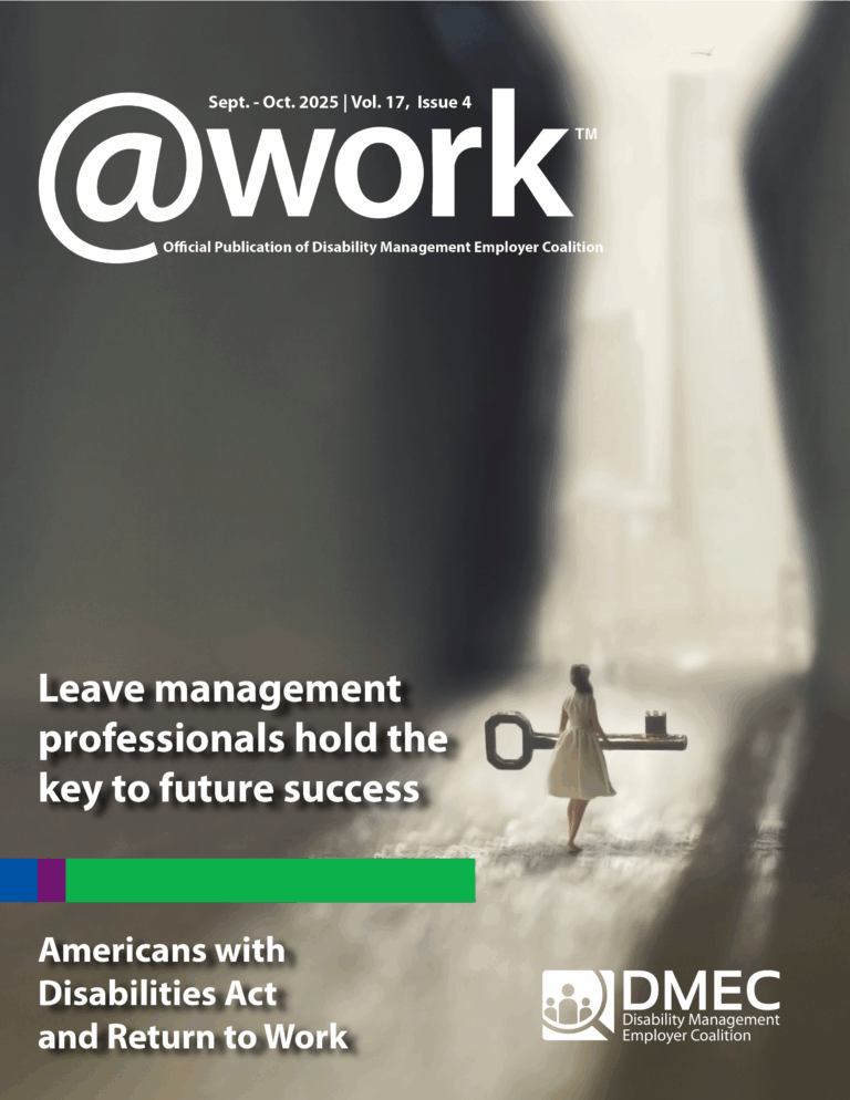 Employers hold the key to designing benefit plan and policy designs that support employees and ensure compliance with an increasing number of local, state, and federal laws. And the need to open doors to new program possibilities that help support employee health and wellness as well as recruit and retain an increasingly diverse workforce is emphasized in this issue of DMEC @Work magazine. It is time to rethink approaches, test benefits that protect and support employee health, and reassess accommodation programs to ensure that practical realities align with organizational intent. This issue of @Work magazine focuses on the Americans with Disabilities Act and Return to Work. The magazine is a DMEC member benefit that helps unlock possibilities for employers of all industries and sizes.
